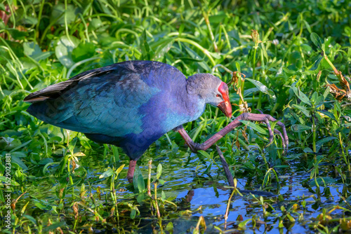 Purple Swamphen (Porphyrio Porphyrio) foraging in wetland, Wakodahatchee wetland, Florida, USA.