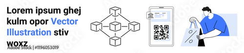 QR code scanning on smartphone next to blockchain network diagram and person carrying shopping bags. Ideal for e-commerce, technology, digital security, blockchain, mobile payment, shopping, online