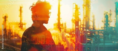 silhouette, person, front, industrial, complex, bright, sunlight, background, symbolize, modern, inspecting, method, action, sharpened, double, process, colours, sample, oil, vibrant, standard, progress, system, closeup