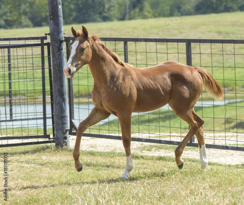 Quater Horse weanling foal trots in paddock
