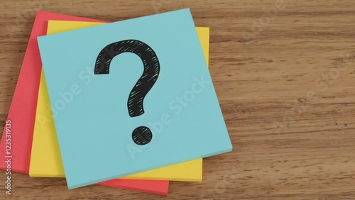 Question mark on a blue sticky note stacked with pink and yellow notes, symbolizing brainstorming, curiosity and creative thinking resting on a wooden desk in a modern workspace