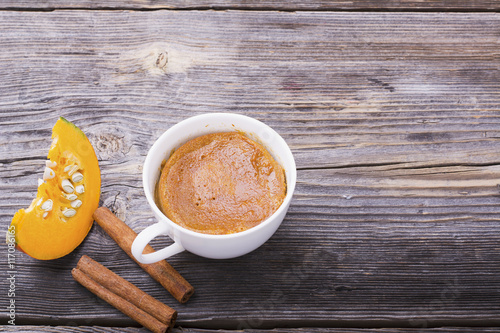 Quick meal breakfast snack in the microwave. Fragrant homemade pumpkin pie fall for five minutes in the cup portions with whipped cream and cinnamon on a wooden background