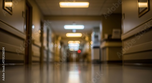 Quiet hospital hallway with soft lighting and warm tones creating a calm atmosphere.