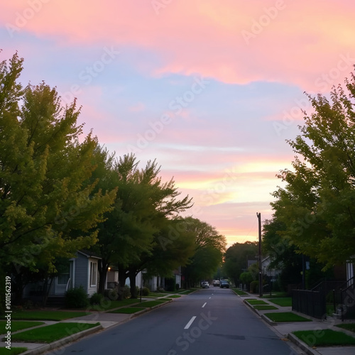 sunset, suburban, street, tree, sky, cloud, peaceful, neighbourhood, evening, road, tranquil, residential, colorful sky, calm, nature, quiet, twilight, house, city landscape, skyline, scenic, beauty, natural, horizon, landscape, serene, clear sky, sunlight, summer, evening light, warm colors, natural beauty, residential area, evening sky