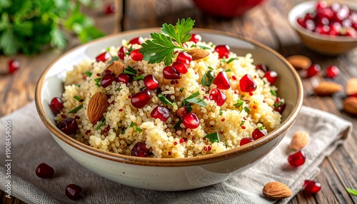 Quinoa Salad with Pomegranate and Almonds Served on Rustic Wooden Table for a Healthy Lifestyle Concept.