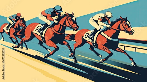 racehorse, jockey, race track, running, speed, competition, sport, vintage, graphic, illustration, poster, vector, digital, art, image, design, retro, colourful, motion, background, racing, equestrian, horse, rider, activity, artwork, fast, excitement, horserace, horizontal, entertainment, leisure, lifestyle