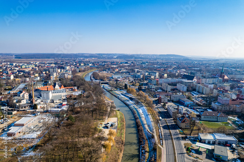 Racibórz miasto na Śląsku w Polsce. Panorama z lotu ptaka w zimie. Rzeka Odra w Raciborzu.