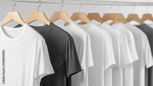 Rack of monochrome t-shirts hanging neatly minimal desi