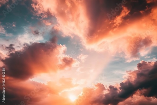 Radiant dusk sky with rays piercing black clouds vivid sky in orange red tones lovely nature sight bold light uplifting scene divine air peaceful calm