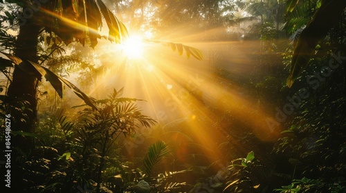 Radiant sunburst through dense, misty forest canopy at sunrise