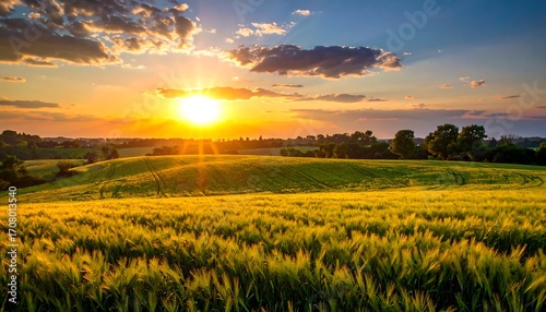 Radiant sunset over lush, rolling fields, casting a golden glow on the tranquil scene