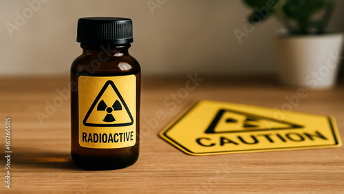 Radioactive Hazard in a Vial: A chilling close-up of a brown glass vial bearing the stark yellow and black Radioactive symbol, warning of the dangerous contents within.
