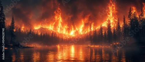 Raging Inferno in National Park, wildfire engulfing trees, flames reaching skyward, smoke billowing, destruction in nature's heart