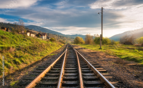 Railroad in mountains at sunset in autumn. Beautiful industrial landscape with railway station, orange trees, green grass, buildings, rocks and blue sky with clouds in fall. Rural railway platform