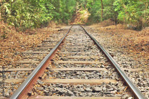 railroad tracks in the forest. Closeup view of Railway Track between the forest