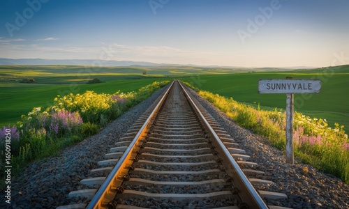 railroad, track, countryside, green, landscape, sunrise, sunset, wildflower, nature, scenic, view, travel, path, meadow, field, transportation, floral, plant, flower, daylight, sunshine, beauty, idylli, grass, horizon, signs, signpost, rail, rural, calm, peaceful, destination, trip, journey, fresh