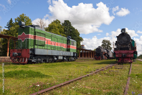 Railway Museum in the town of Haapsalu. In the foreground is the old locomotive and the train station. Scene photographed in the autumn season. Estonia.