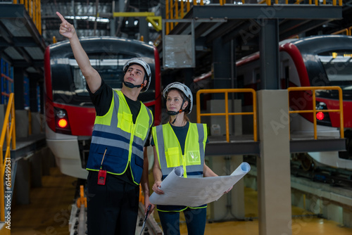 Railway technicians collaborate with engineers to inspect the electric train propulsion system in order to maintain the electric trains in the depot.