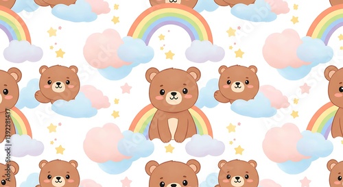 bear, brown, cute, rainbow, cloud, sky, star, pastel, pattern, repeating, seamless, adorable, fluffy, cartoon, illustration, design, sweet, happy, whimsical, childish, baby, toddler, textile, print, background