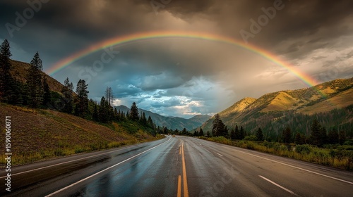 rainbow, road, mountain, cloud, wet, nature, scenic, forest, landscape, highway, storm, light, colours, dramatic, gold, evening, tree, asphalt, travel, view, path, vista, beauty, mountain, summer, horizon, pathway, scene, cloudscape, driving, vacation, adventure, freedom, rain, green, yellow, dark, grey, amber, sunshine, spectacle, wonder, amazing, serene