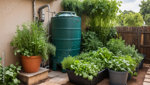 rainwater, tank, home, garden, herb, vegetable, watering, system, storage, harvesting, eco, nature, supply, irrigation, organic, environmental, sustainable, drainage, leaf, moisture, technology, collector, setup, natural, plastic, hydratation, conservation, green, plantation, scene, backyard, saving, climate, botanical, vegetation, water source, flow