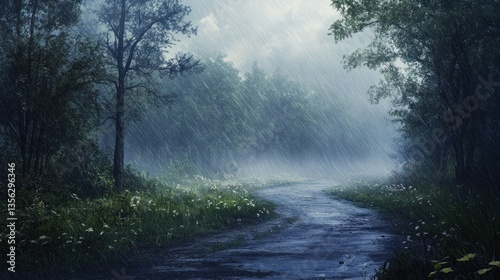 Rainy day path, A tranquil woodland scene during a downpour