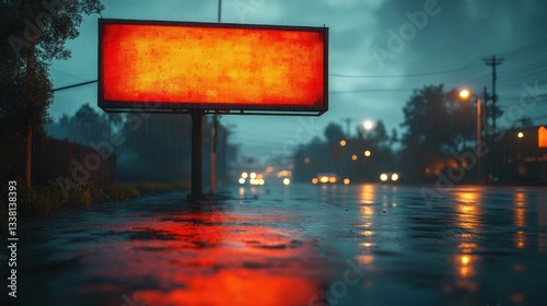 billboard, rain, night, city, street, light, wet, road, urban, dark, orange, glowing, illuminated, atmospheric, gloomy, evening, water, asphalt, scene, landscape, traffic, car, tree, sky, damp, shiny, wetness, city landscape, street light, signal, advertisement, publicity, urban scene, night scene, illumination, rainy, city lights