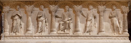 RAVENNA, ITALY - JANUARY 29, 2020: The old christian Sarcophagus of bishop Liberio III in the church Chiesa di San Francesco froem 4. cent.