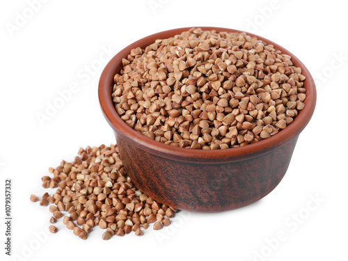 Raw buckwheat in bowl isolated on white