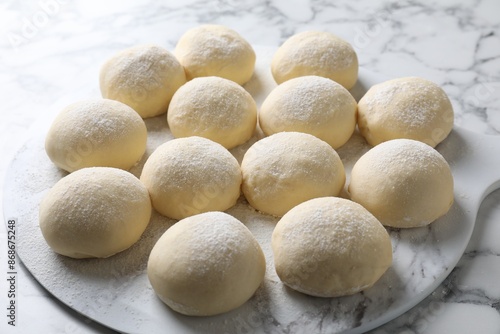 Raw dough balls on white marble table