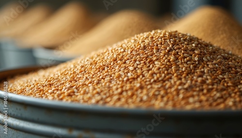 Raw grain piled in storage bins. Close view shows seed texture and golden color. Harvested cereal crop ready for processing and food production.