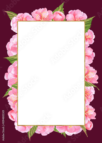 Ready-made postcard with pink Sakura blossoms, green leaves and rectangular golden frame. Invitation, leaflet layout. Hand-drawn watercolor illustration