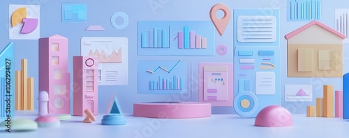 Real estate market analysis with property icons and financial graphs, modern property data, 3D illustration