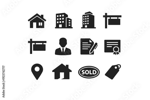 real, estate, solid, icon, set, house, apartment, office, building, sale, signs, rent, agent, real estate, business building, realtor
