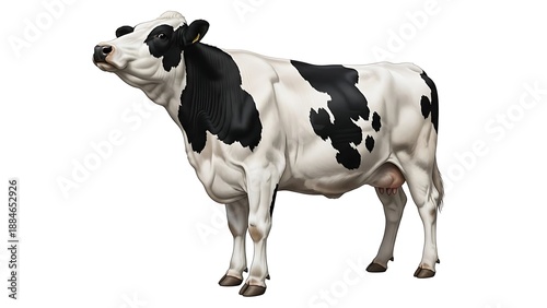 Realistic 3D rendering of a black and white cow standing alone on a white background.