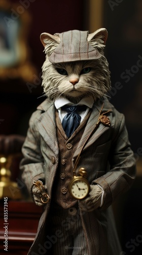 realistic cat as a detective Sherlock Holmes style smoking pipe British, generative ai