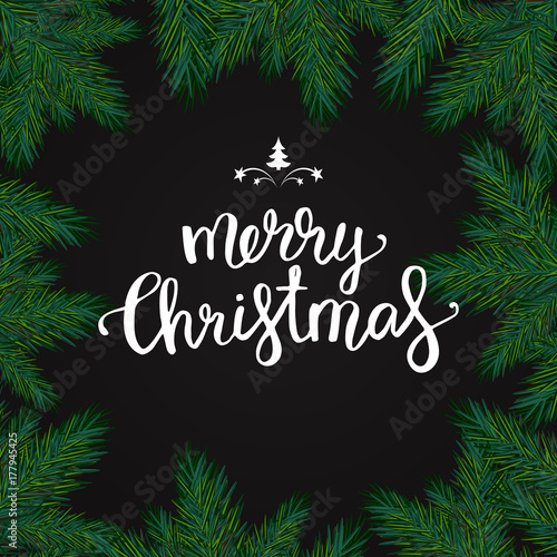 Realistic christmas frame with fir. Merry Christmas typography lettering pine tree decoration border card