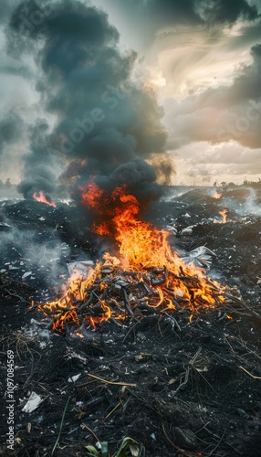 Realistic depiction of burning waste emitting smoke and flames, emphasizing environmental pollution