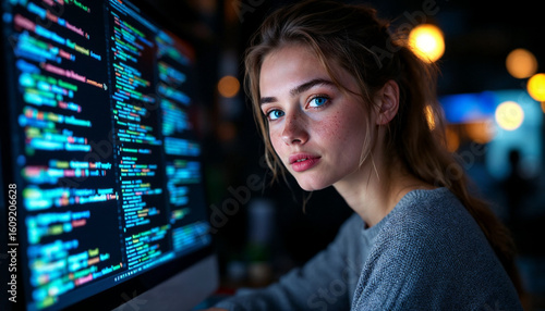 Realistic digital art of a young white woman with freckles coding at a computer, warm glow.