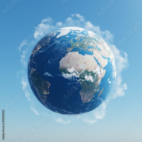 Realistic floating Earth in a blue sky with clouds and peaceful atmosphere
