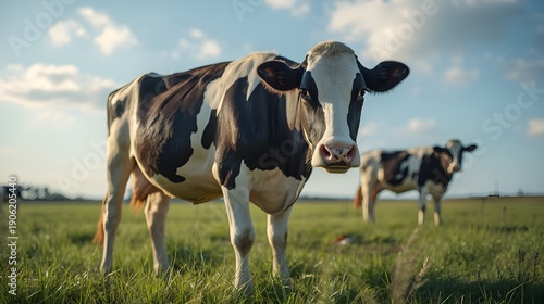 cow, cattle, dairy, holstein, farm animal, farm, farming, pasture, agriculture, rural, countryside, animal, mammal, herd, grazing, milk, nature, sunlight, daylight, sky, field, green, natural, realistic, healthy, organic, sustainability, ranch, barnyard, grass, fresh, motion, detail, texture, closeup, depth, sharpened, farmland, pastoral, ecosystem, breeding, husbandry, environment