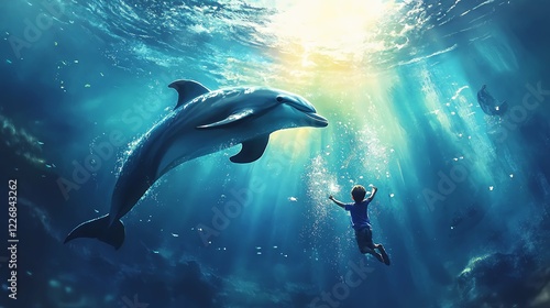 Realistic Illustration of a Kid Boy Scuba Diving with a Dolphin