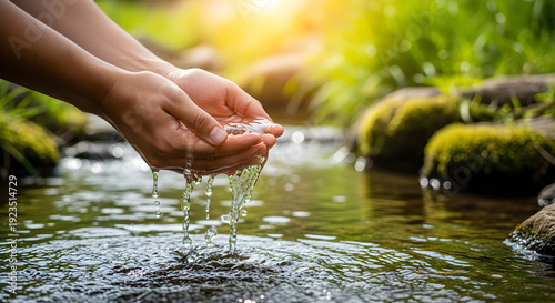 Realistic image of hands holding fresh flowing water, representing access to clean water and sustainability efforts.