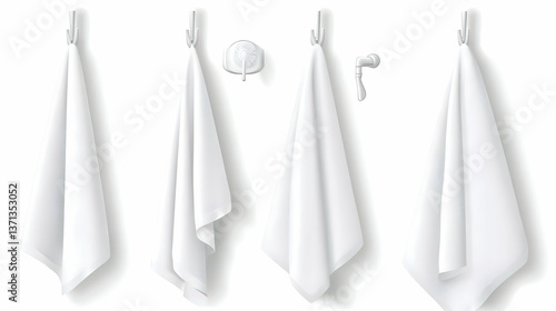 Realistic Photo of White Hanging Towels on Hooks with Shadow and White Background