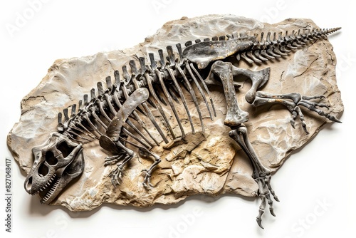 Realistic photograph of a complete Fossils,solid stark white background, focused lighting
