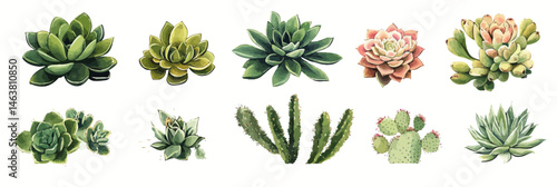 Realistic watercolor style vector set of various succulent plants and cacti illustrations with detailed leaves and spines isolated on white background