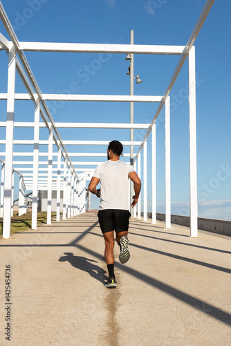 athlete, running, sport, man, fitness, training, runner, exercise, healthy, lifestyle, physical exercise, jogging, active, outdoors, sunny, day, summer, modern, white, structure, architecture, urban, city, street, activewear, shoe, short, t, shirt, back, rear, view, shadow, well-being, wellness, african american