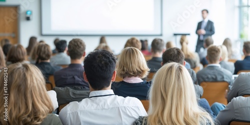 Rear view of blurred audience in the lecture hall, speaker presenting on the podium