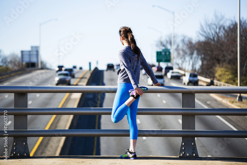 woman, exercising, footpath, clear sky, city, backview, lifestyle, carefree, road, jogging, determination, transportation, athlete, fitness, physical activity, healthy lifestyle, freedom, flexibility, car, sunlight, railing, plant, holding, copy space, full-length, avocation, outdoors, day, one person, missy, young adult, female