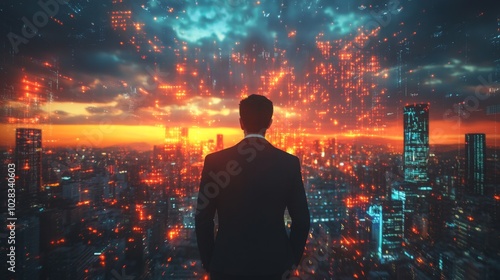 Rear View of Young Businessman Looking at Arrows in Smart Office Exploring Opportunities for Career Growth and Business Success